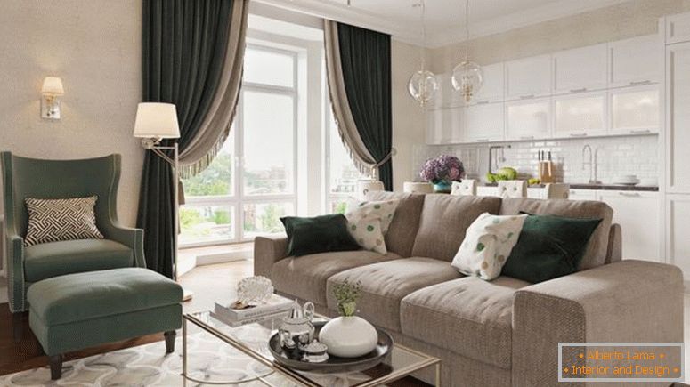 Dans cet appartement confortable et charmant ne fait que 56 mètres carrés, et il ressemble à une maison de géant d'une manière moderne. La présence d'un petit carré ne vous oblige pas à abandonner des figures sculpturales élégantes, des supports dorés dans des tissus d'ameublement et de belles et belles armatures pour peintures. Au contraire, avec toute cette splendeur, vous allez décorer un espace modeste, quelque chose de profond et de irremplaçable.