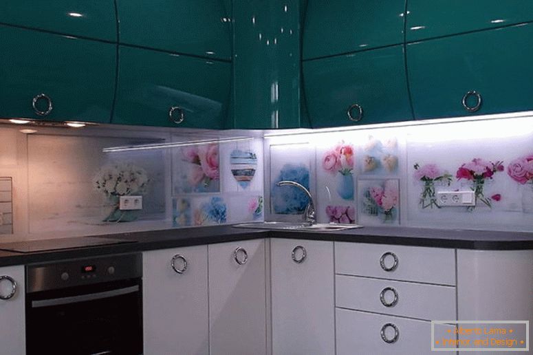 Une combinaison de couleurs vives est également acceptable. Le set de cuisine blanc-vert est parfaitement assorti à un papier peint bleu avec un motif floral.