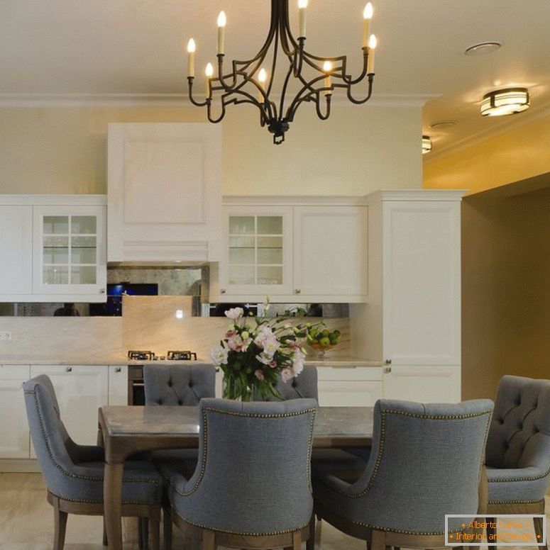 Pour éclairer la surface de travail, vous pouvez utiliser des lampes LED situées sous les armoires suspendues. Au-dessus de la table à manger, vous pouvez disposer de 1 à 2 lampes à suspension avec abat-jour, qui donneront une lumière directionnelle qui obscurcira le reste de l'espace. Cela créera en outre un espace détaché confortable dans lequel toute la famille se réunit.