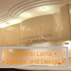 Dans cette cuisine, la combinaison de matériaux a été créée non par le fabricant de carreaux, mais par le designer d'intérieur lui-même. Voulant donner à cette cuisine l'effet des "murs d'un ancien château", il choisit pour cela de grandes plaques de calcaire et un tablier haut - une dalle de verre multicolore aux tons sombres.